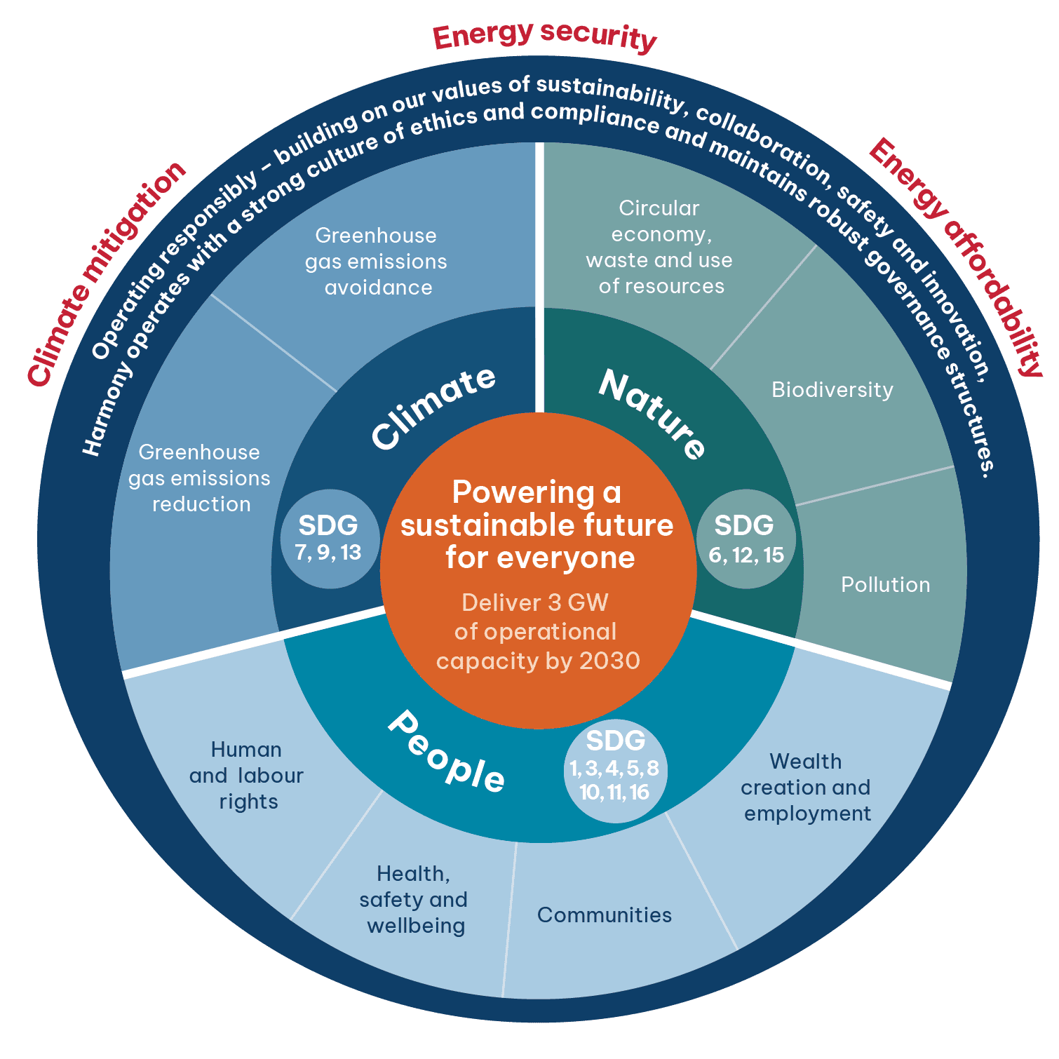 The Harmony Energy Board of Directors has ultimate responsibility for setting our sustainability approach, commitments and policies. Our Sustainability Committee oversees, monitors and reviews our performance and the Group Sustainability Team, led by the Head of Sustainability, is responsible for integrating our sustainability approach into key business areas and measuring, monitoring and reporting on sustainability performance.